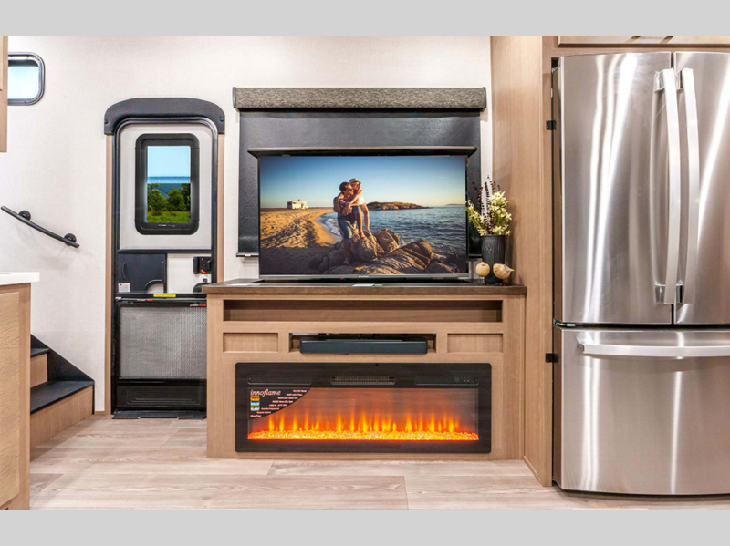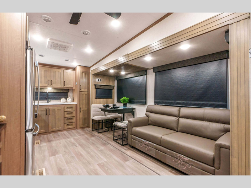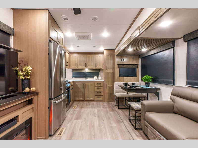 Sleeps 4 Slides 3 Length 37 ft 10 in Ext Width 8 ft Ext Height 12 ft 8 in Interior Color Mink, Pebble Hitch Weight 2260 lbs GVWR 13700 lbs Dry Weight 11600 lbs Cargo Capacity 2100 lbs Fresh Water Capacity 76 gals Grey Water Capacity 50 gals Black Water Capacity 50 gals Tire Size 16" Furnace BTU 35000 btu Available Beds King Refrigerator Type Residential Refrigerator Size 18 cu ft Convection Cooking Yes Cooktop Burners 4 Shower Size 48" x 30" Number of Awnings 1 Axle Weight 9340 lbs LP Tank Capacity 30 lbs Water Heater Type On Demand Tankless AC BTU 15000 btu TV Info LR 43" Smart LED TV Awning Info 18' Power w/LED Light Strip Axle Count 2 Washer/Dryer Available Yes Number of LP Tanks 2 Shower Type Shower w/Seat Electrical Service 50 amp Similar Floorplans