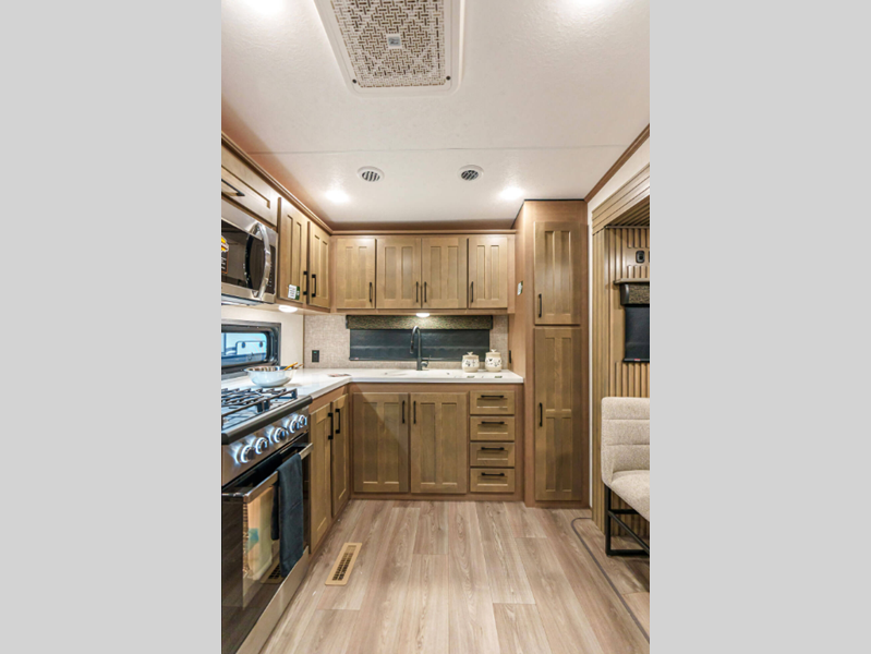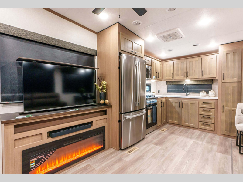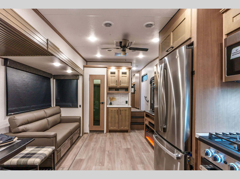 Sleeps 4 Slides 3 Length 34 ft 10 in Ext Width 8 ft Ext Height 12 ft 8 in Interior Color Mink, Pebble Hitch Weight 2270 lbs GVWR 12995 lbs Dry Weight 11080 lbs Cargo Capacity 1915 lbs Fresh Water Capacity 76 gals Grey Water Capacity 90 gals Black Water Capacity 50 gals Tire Size 16" Furnace BTU 35000 btu Available Beds King Refrigerator Type Residential Refrigerator Size 18 cu ft Convection Cooking Yes Cooktop Burners 4 Number of Awnings 1 Axle Weight 8810 lbs LP Tank Capacity 30 lbs Water Heater Type On Demand Tankless AC BTU 15000 btu TV Info LR 43" Smart LED TV Awning Info 16' Power w/LED Light Strip Axle Count 2 Washer/Dryer Available Yes Number of LP Tanks 2 Shower Type Shower w/Seat Electrical Service 50 amp Similar Floorplans