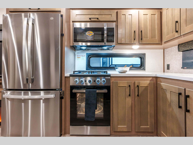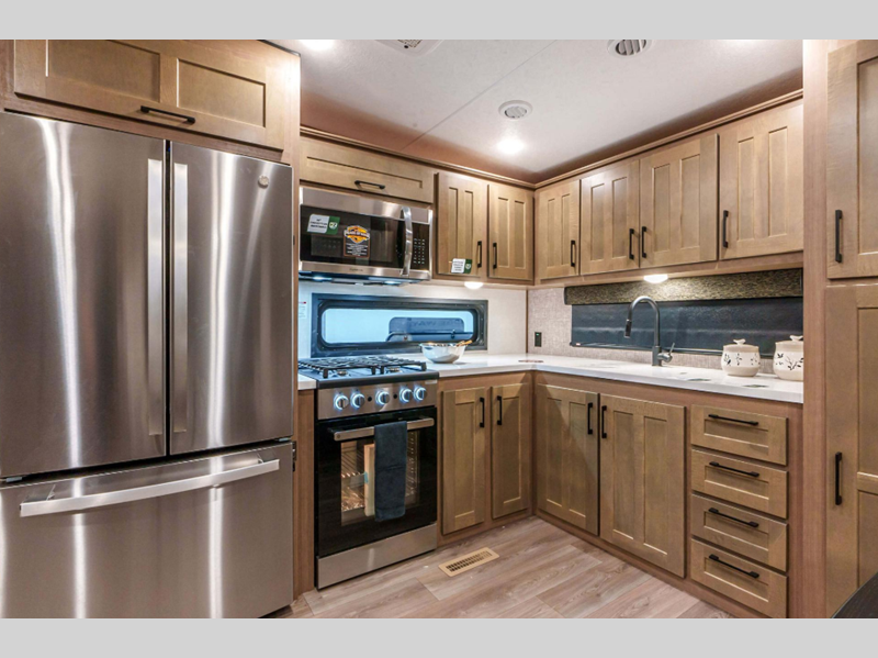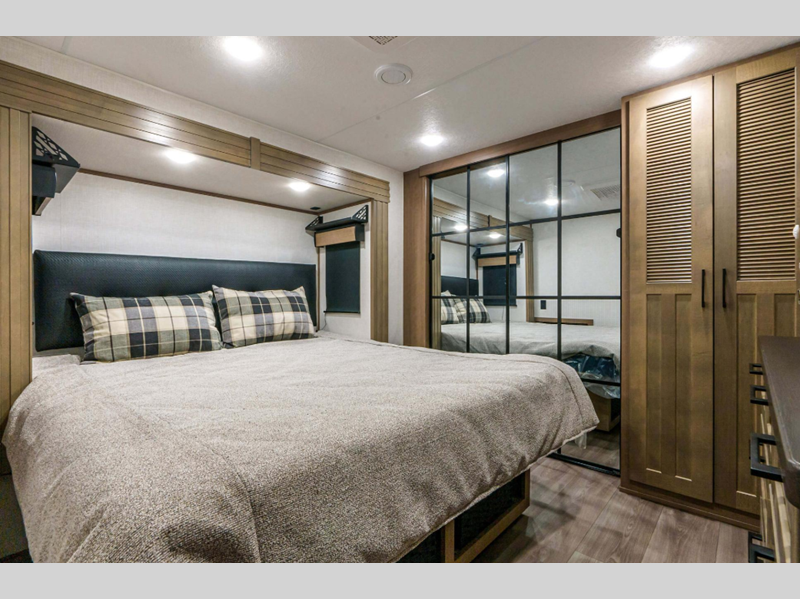 Sleeps 4 Slides 2 Length 33 ft 6 in Ext Width 8 ft Ext Height 12 ft 6 in Interior Color Mink, Pebble Hitch Weight 2070 lbs GVWR 12995 lbs Dry Weight 9910 lbs Cargo Capacity 3085 lbs Fresh Water Capacity 76 gals Grey Water Capacity 90 gals Black Water Capacity 50 gals Tire Size 16" Furnace BTU 35000 btu Available Beds King Refrigerator Type Residential Refrigerator Size 18 cu ft Convection Cooking Yes Cooktop Burners 4 Shower Size 48" x 30" Number of Awnings 1 Axle Weight 7840 lbs LP Tank Capacity 30 lbs Water Heater Type On Demand Tankless AC BTU 15000 btu TV Info LR 50" Smart LED TV Awning Info 20' Power w/LED Light Strip Axle Count 2 Washer/Dryer Available Yes Number of LP Tanks 2 Shower Type Shower w/Seat Electrical Service 50 amp Similar Floorplans