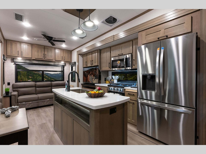 Each fifth wheel is built with 101" wide-body construction, an extra-reinforced heavy-duty front fiberglass cap, and include the All-Weather Insulation Package so you can camp all year around. The six-point hydraulic auto-leveling makes setting up easier, and the KZ Engage Powered by OneControl features an app that you can download to control all of your unit's functions right from your smartphone. The Durango Gold's kitchen is a chef's dream with its 26 cu. ft. house refrigerator with a 2,000W inverter, 30" convection microwave, 24" oven with four-burner range, plus abundant storage!