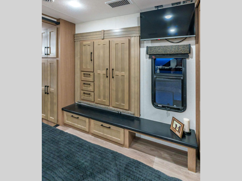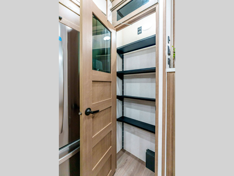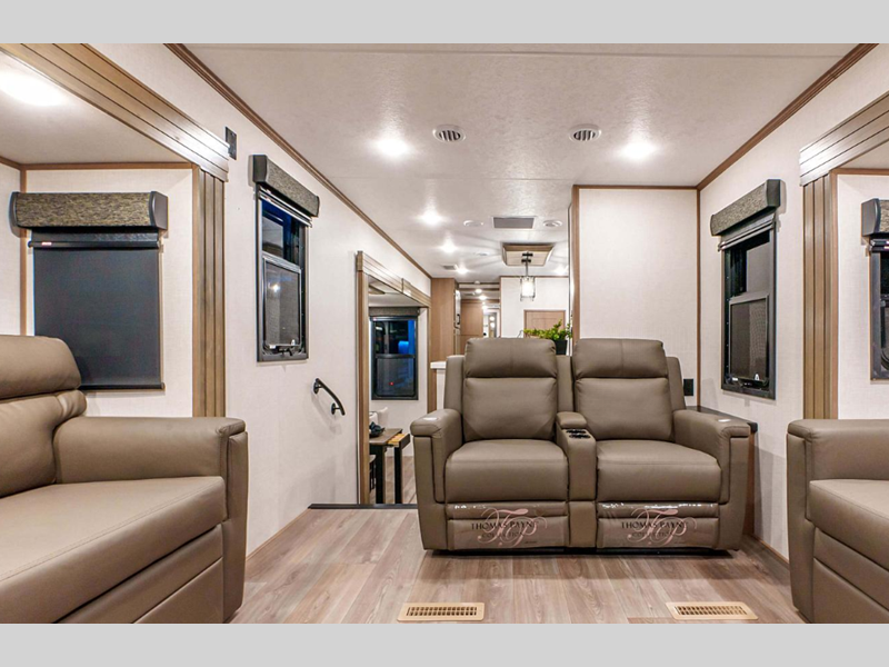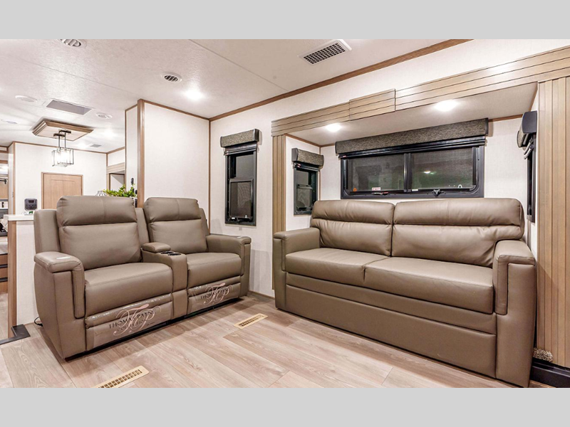 Sleeps 4 Slides 4 Length 34 ft 11 in Ext Width 8 ft 5 in Ext Height 13 ft 6 in Int Height 6 ft 8 in Interior Color Mink, Pebble Exterior Color Black Pearl Full Body Paint Option Hitch Weight 2650 lbs GVWR 14995 lbs Dry Weight 12170 lbs Cargo Capacity 2825 lbs Fresh Water Capacity 76 gals Grey Water Capacity 90 gals Black Water Capacity 50 gals Tire Size 17.5" Furnace BTU 40000 btu Available Beds King Refrigerator Type House Refrigerator with 2000W Inverter Refrigerator Size 26 cu ft Convection Cooking Yes Cooktop Burners 4 Shower Size 48" x 30" Number of Awnings 1 Axle Weight 9520 lbs LP Tank Capacity 30 lbs Water Heater Type On Demand Tankless AC BTU 45000 btu TV Info LR 50" Smart LED TV, BR 32" Smart LED TV Awning Info 17' Electric w/LED Light Strip Axle Count 2 Washer/Dryer Available Yes Number of LP Tanks 2 Shower Type Shower w/Seat Electrical Service 50 amp Similar Floorplans