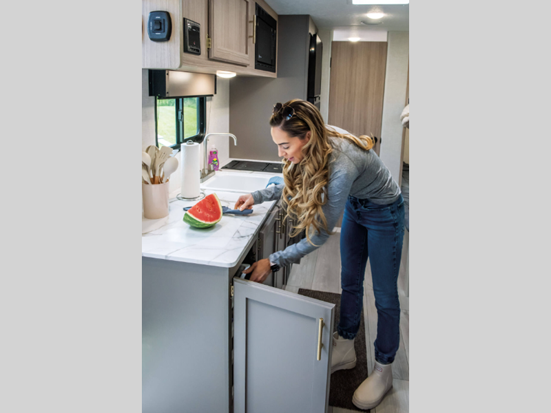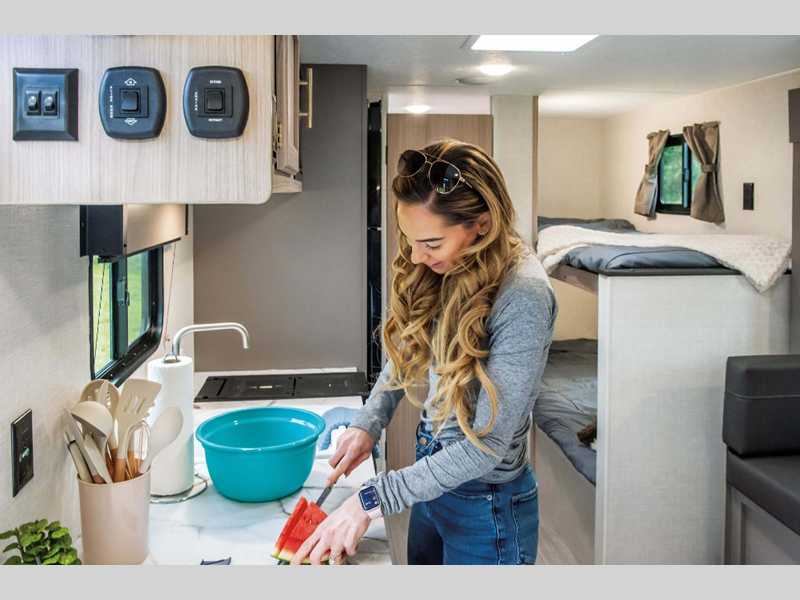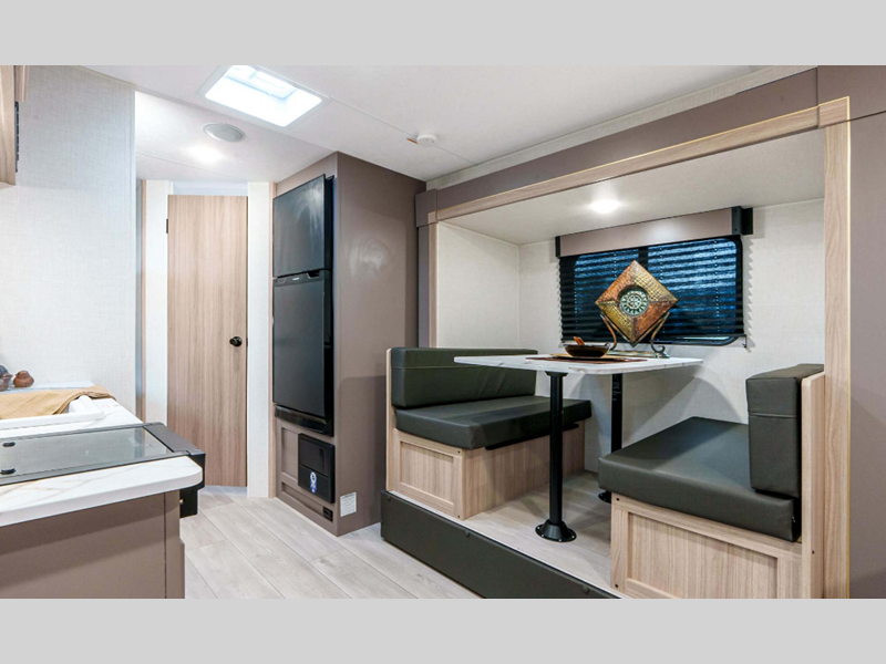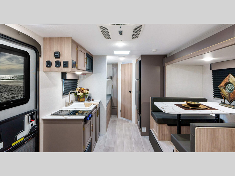 Sleeps 7 Slides 1 Length 22 ft 10 in Interior Color Ashwood, Mushroom Grey Hitch Weight 500 lbs GVWR 4800 lbs Dry Weight 3810 lbs Cargo Capacity 990 lbs Fresh Water Capacity 20 gals Grey Water Capacity 26 gals Black Water Capacity 26 gals Tire Size 15" Furnace BTU 20000 btu Number Of Bunks 2 Available Beds Queen Refrigerator Type 12V Refrigerator Size 8 cu ft Cooktop Burners 2 Number of Awnings 1 Axle Weight 3310 lbs LP Tank Capacity 20 lbs Water Heater Type Tankless AC BTU 13500 btu Awning Info 15' Power Axle Count 1 Number of LP Tanks 1 Shower Type Neo-Angled Similar Floorplans