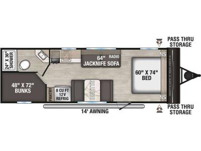 Double-size bunk beds provide ample space for kids or guests, while the front bed offers a cozy retreat for adults and nightstands add a touch of home. The full bathroom is equipped with everything you need to start your day feeling refreshed. The kitchen features an 8 cu refrigerator, two-burner cooktop, and sink, making meal prep easy. Plus, the pantry provides storage for your favorite snacks and ingredients. The jacknife sofa and booth dinette offer comfortable seating for meals, games, or movie nights.