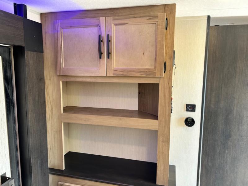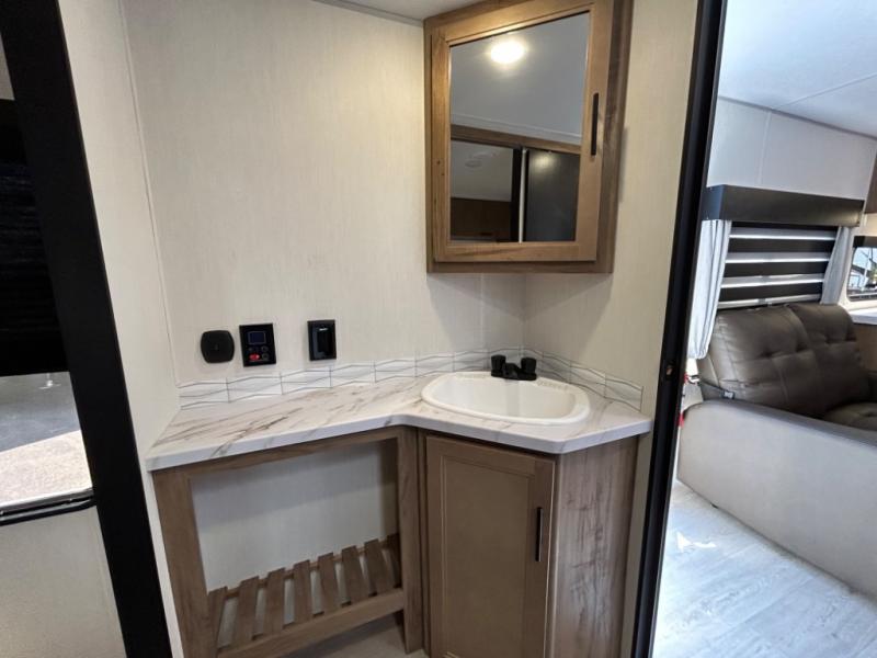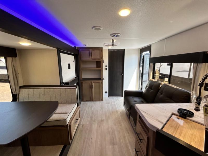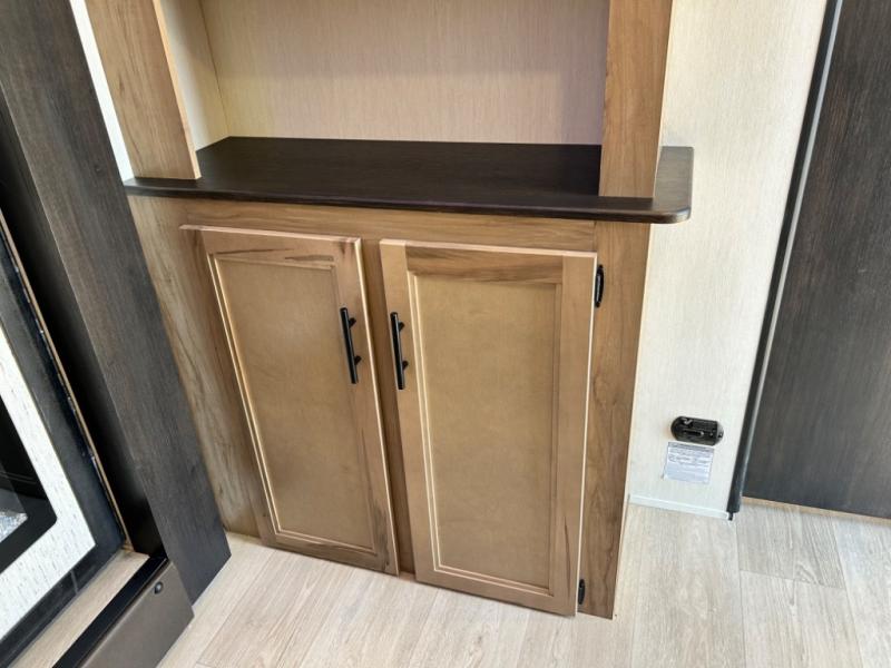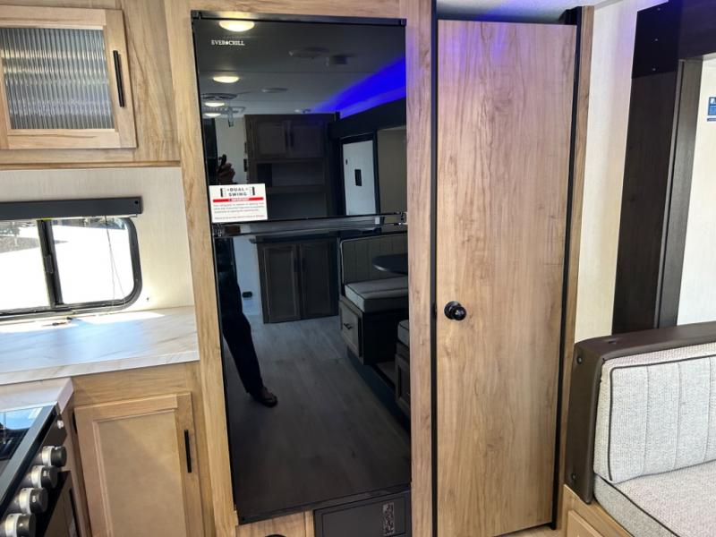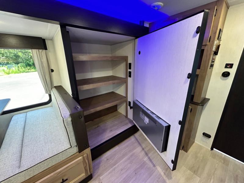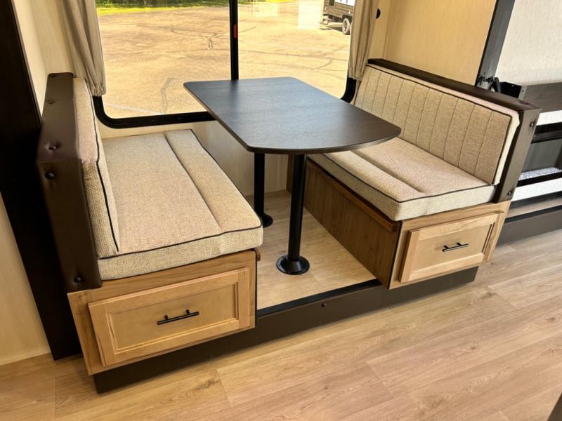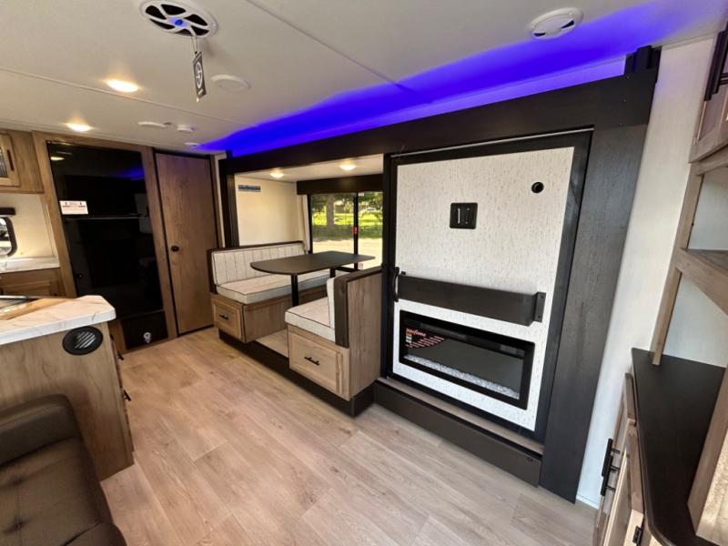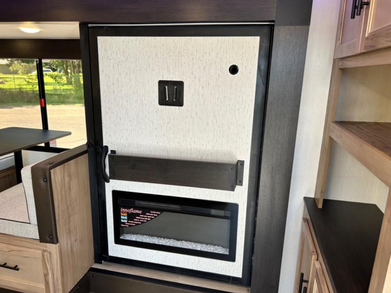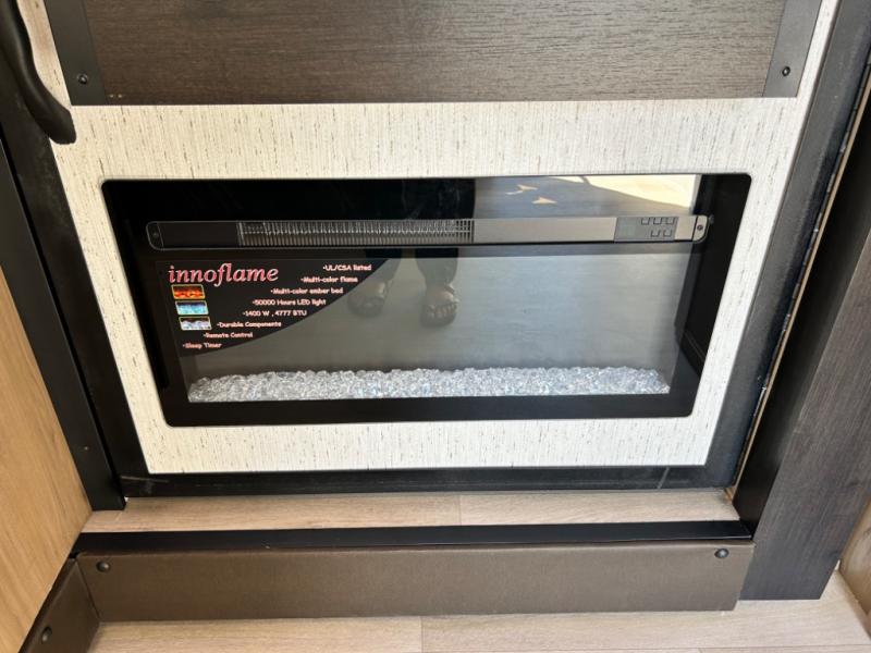You'll love every minute spent in this single slide out travel trailer, whether you're cooking dinner on the outside kitchen or in the rear kitchen, relaxing on the sofa across from the fireplace, or sleeping on the RV king bed in the front master bedroom! There are hidden shelves behind the fireplace for convenient storage, and the booth dinette within the slide provides a place to dine together. The walk-thru bath is spacious, and includes a tub/shower, toilet, and sink with counter space.
