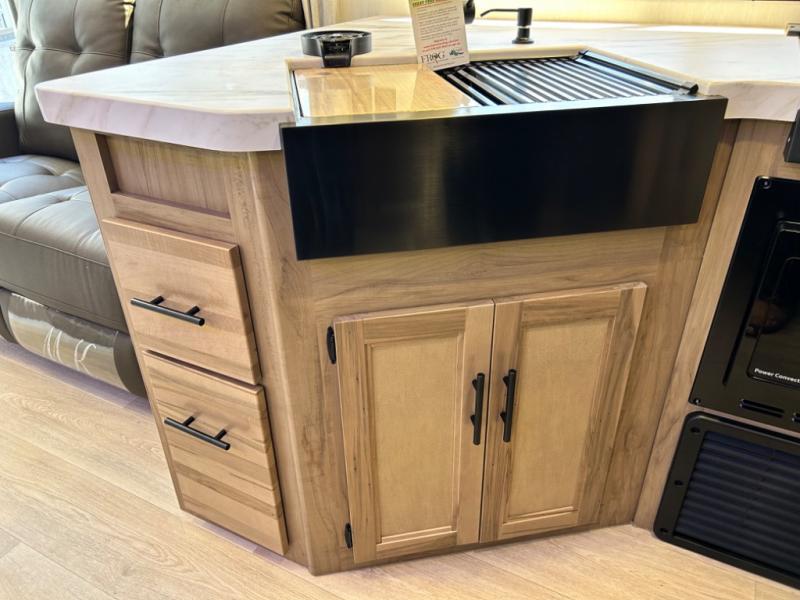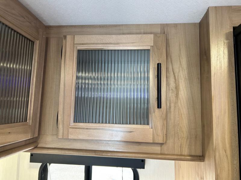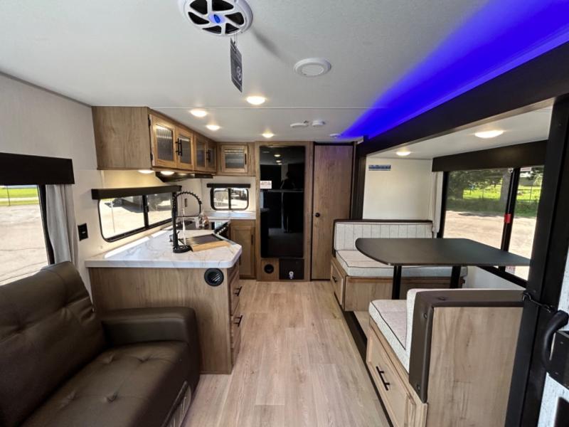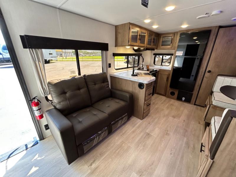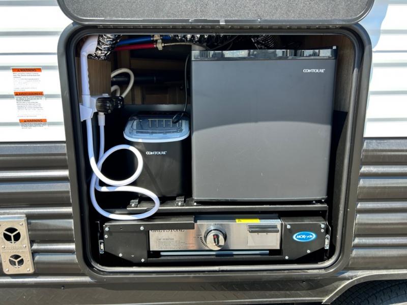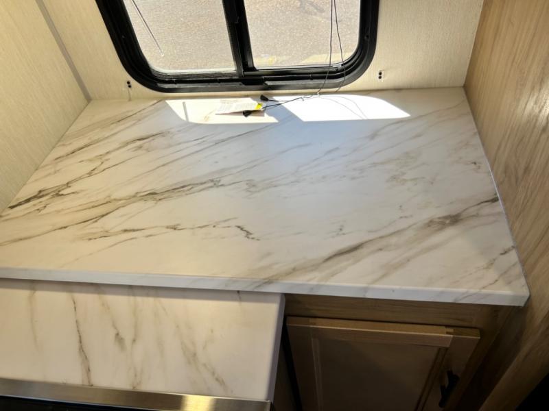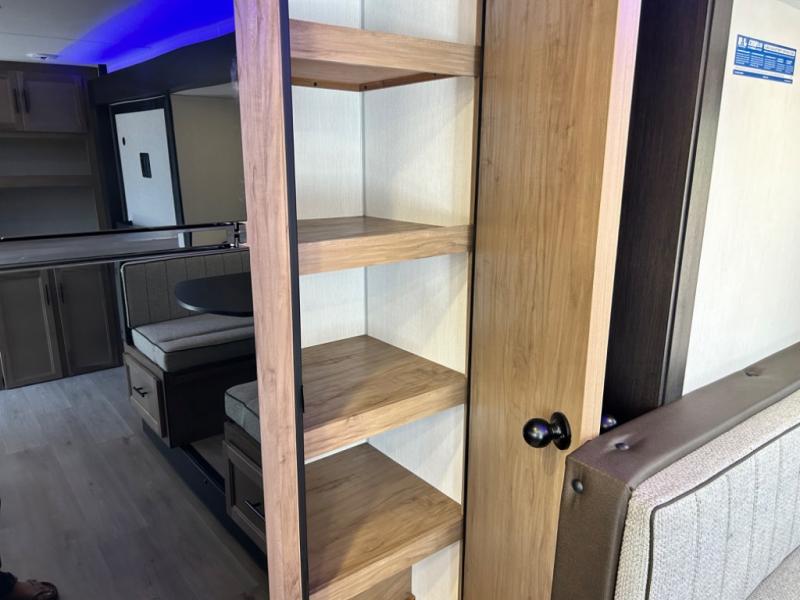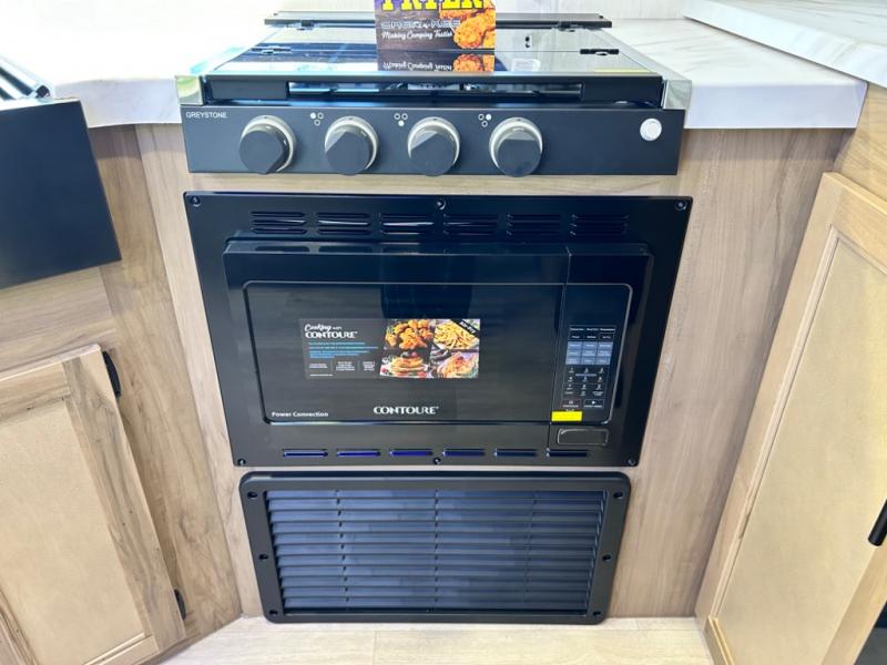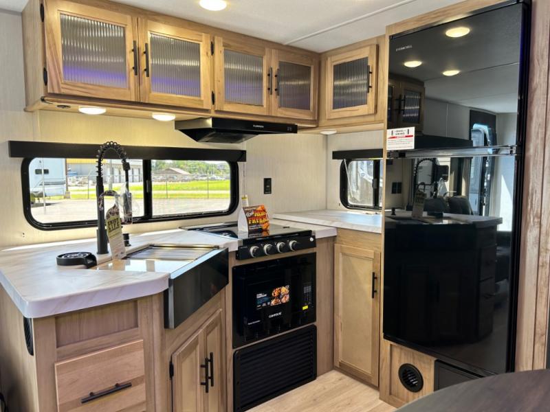 You'll love every minute spent in this single slide out travel trailer, whether you're cooking dinner on the outside kitchen or in the rear kitchen, relaxing on the sofa across from the fireplace, or sleeping on the RV king bed in the front master bedroom! There are hidden shelves behind the fireplace for convenient storage, and the booth dinette within the slide provides a place to dine together. The walk-thru bath is spacious, and includes a tub/shower, toilet, and sink with counter space.