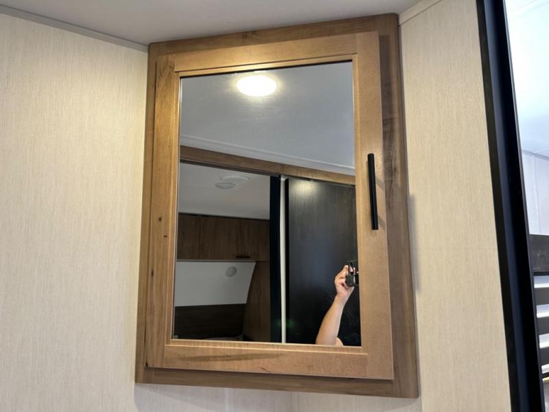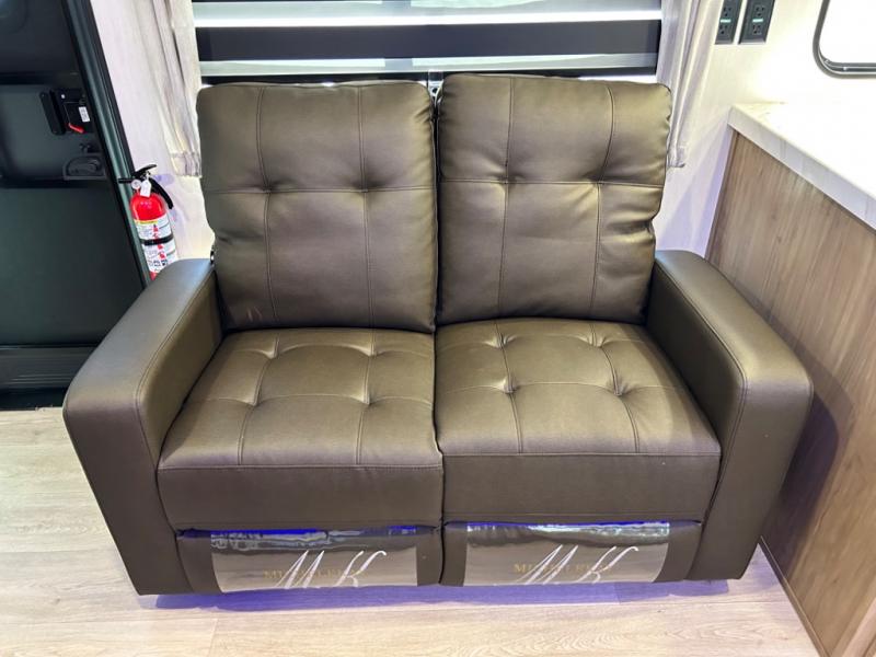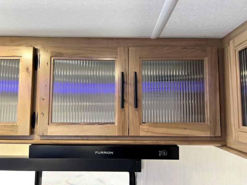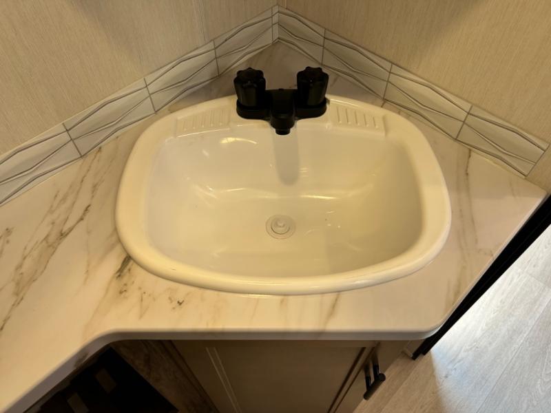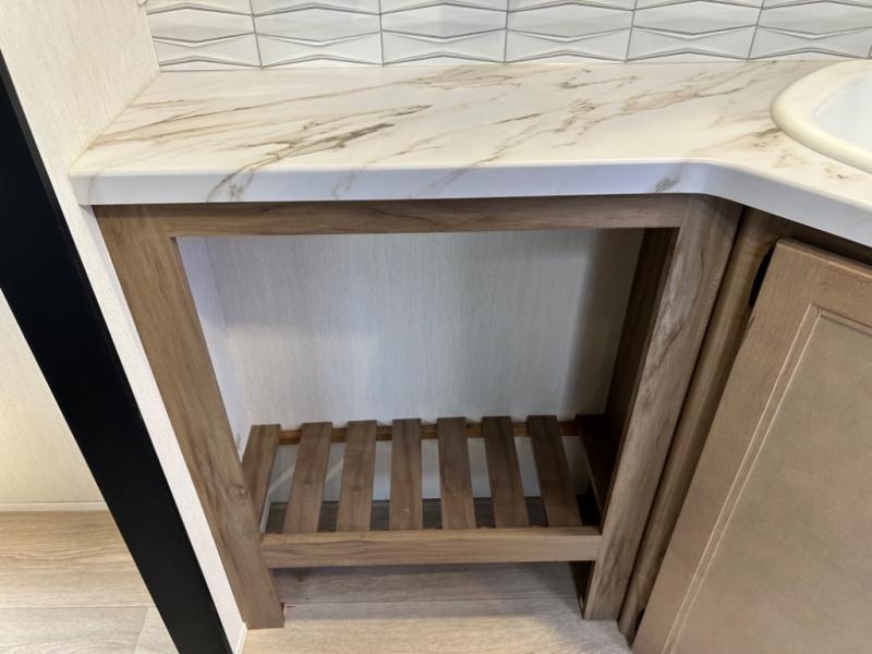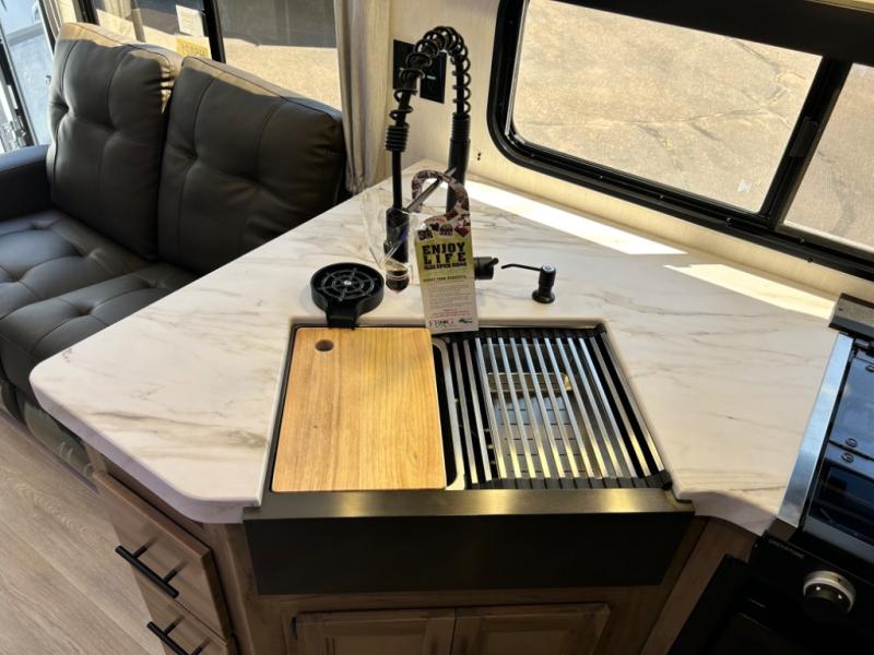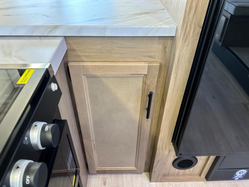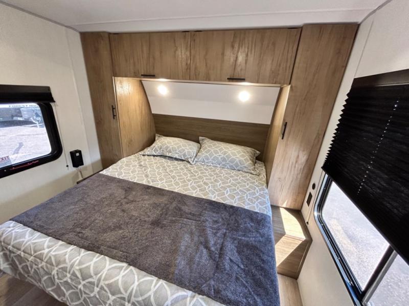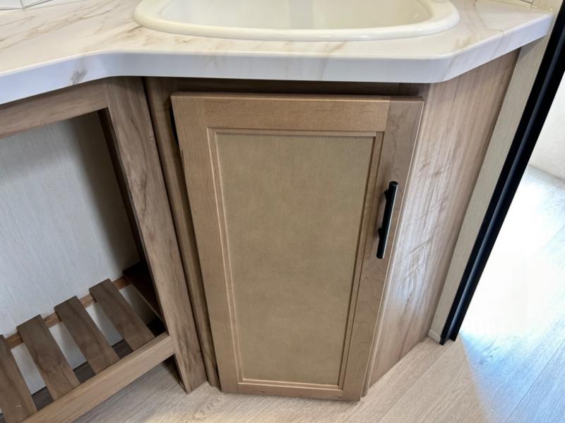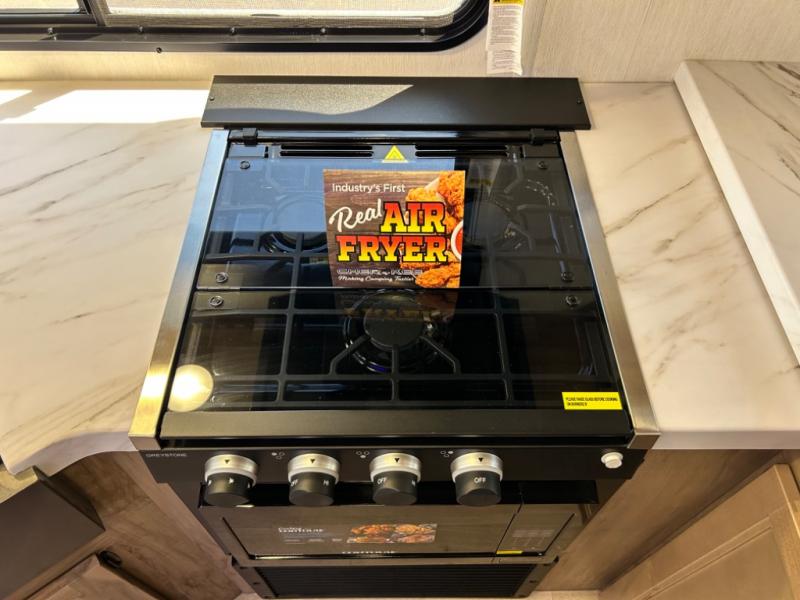 You'll love every minute spent in this single slide out travel trailer, whether you're cooking dinner on the outside kitchen or in the rear kitchen, relaxing on the sofa across from the fireplace, or sleeping on the RV king bed in the front master bedroom! There are hidden shelves behind the fireplace for convenient storage, and the booth dinette within the slide provides a place to dine together. The walk-thru bath is spacious, and includes a tub/shower, toilet, and sink with counter space.