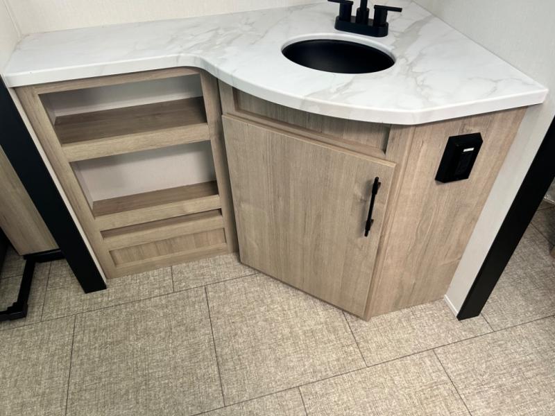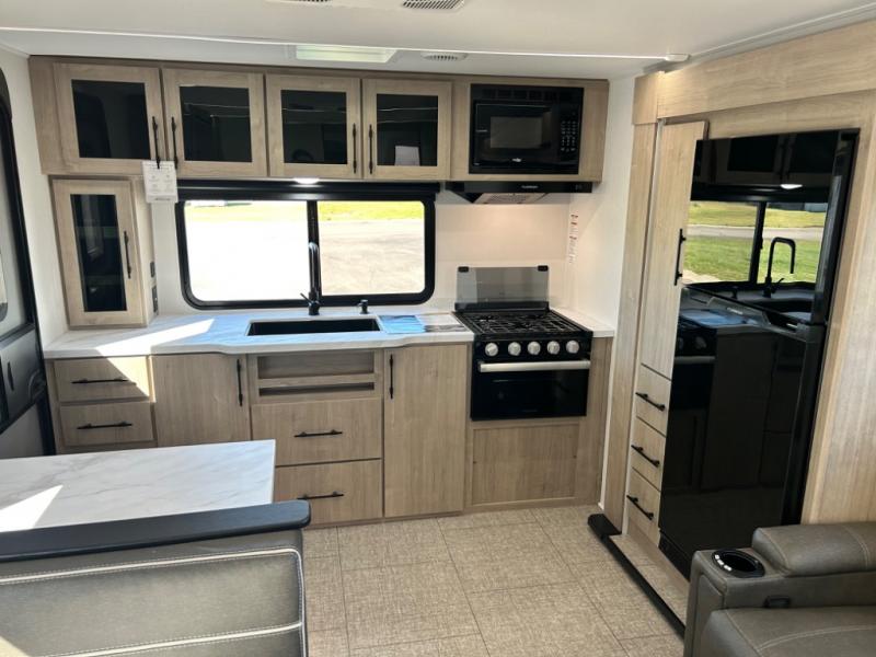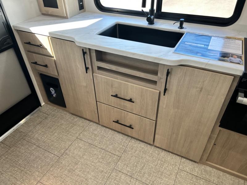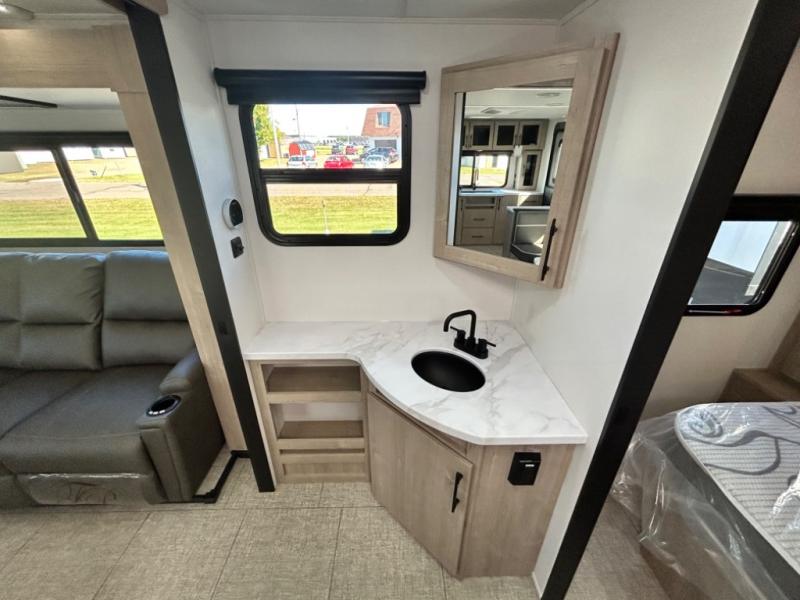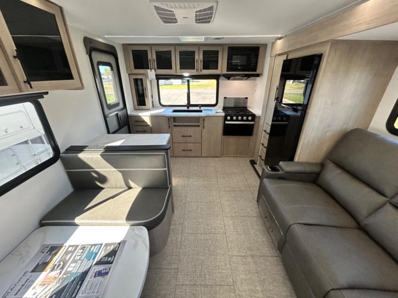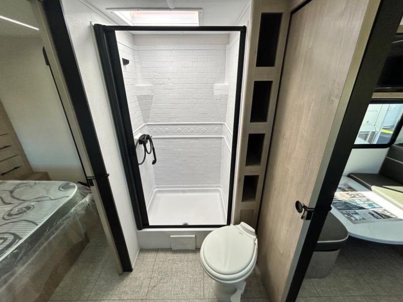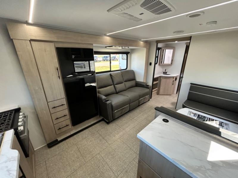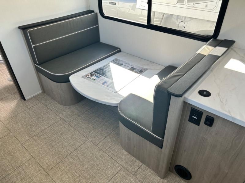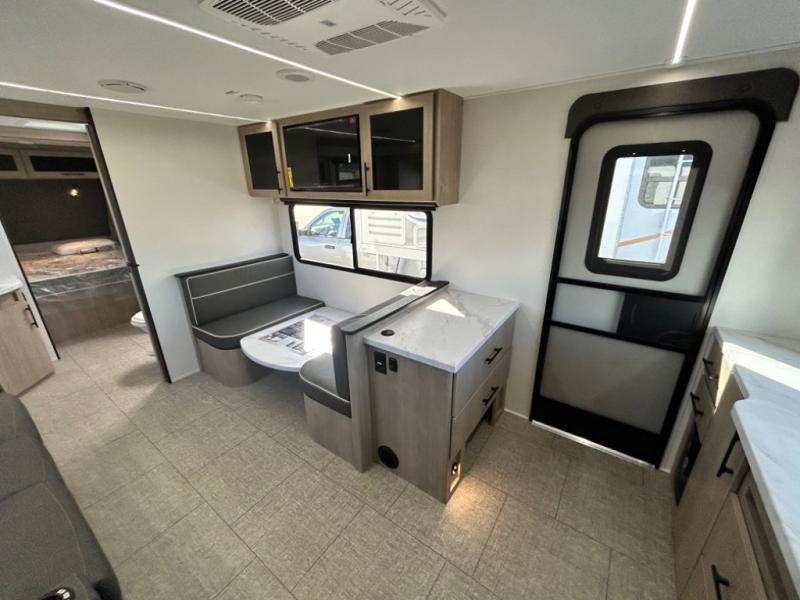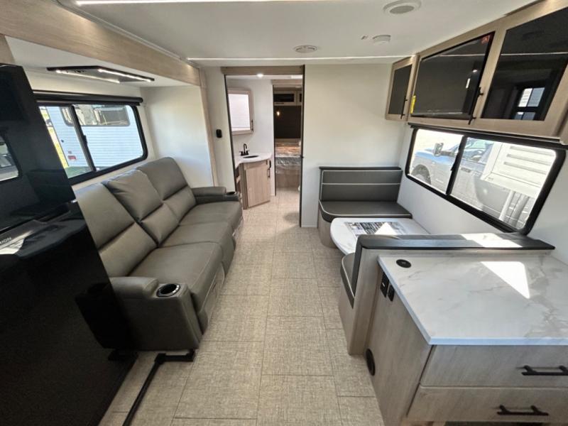 Treat yourself to a weekend of fun in this Imagine XLS travel trailer! Whether it's just you and your spouse, or you've chosen to bring along a group of friends, this trailer will meet the need. The front bedroom can sleep two people on the walk-around queen-size bed. The bedroom is quite functional because it not only contains the second exterior entry door, but it also has a private entrance into the walk-through bathroom since it is located on the other side of the bathroom. The booth dinette is functional too because it can transform from a dining location into a sleeping location, and the theater seating is directly across from the LED TV for easy viewing.