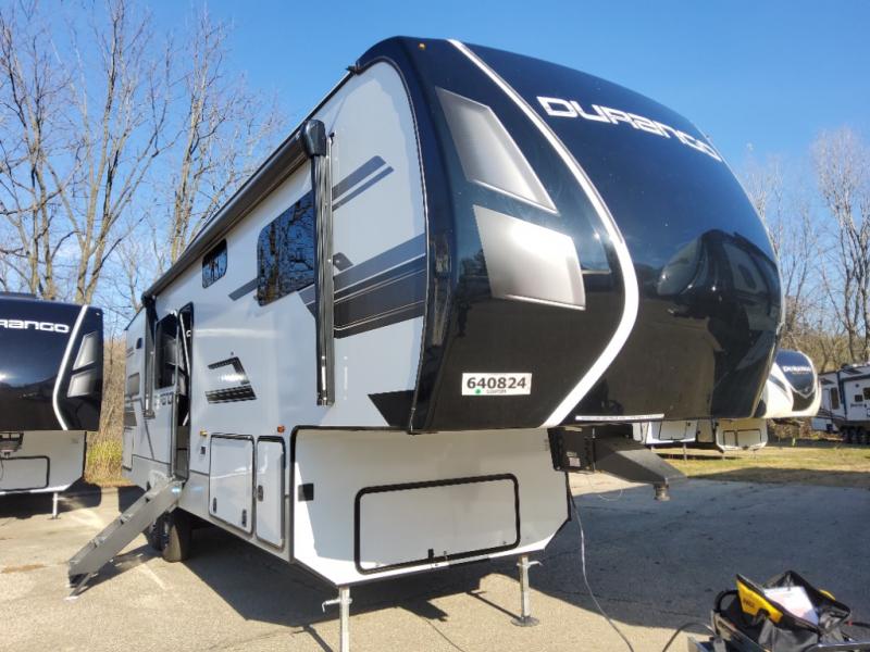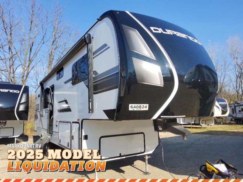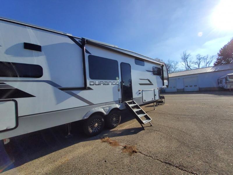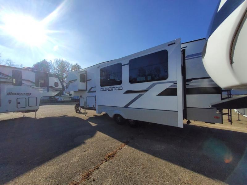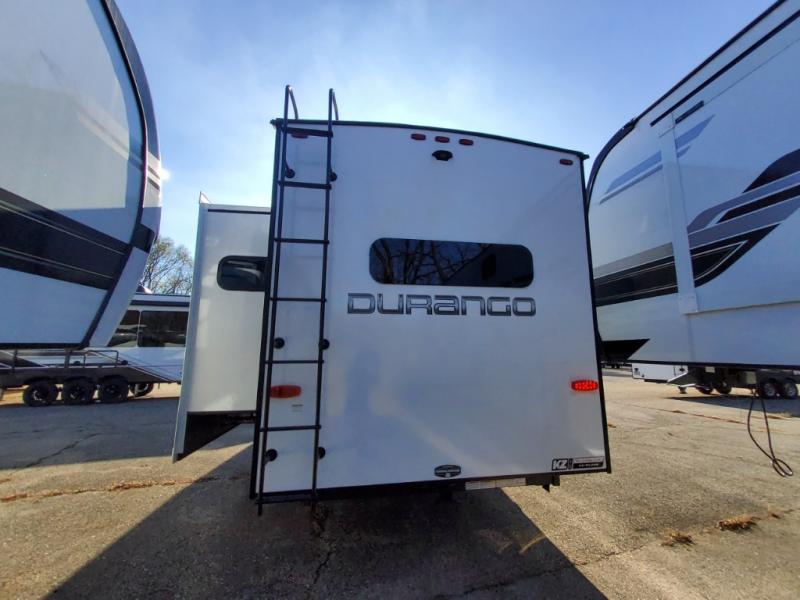 Enjoy full time living, an affordable price, and a wide body construction for more living space with every one of these KZ Durango light high-profile fifth wheels! These luxury units can be used all year round with the all-weather insulation package, the 3" x 14" foam-core in-floor straight-line heating system with a 35,000 BTU furnace, and the 15,000 BTU ducted roof A/C which optimizes the airflow by an average of 40% for better performance, cooling time, and reduction of noise. A few other construction features you will appreciate include a one piece, seamless walk-on Tufflex roofing material, Pex® in-floor heated waterlines, a Lamilux® gelcoat fiberglass exterior, and Dexter® axles with self adjusting brakes and height adjusting hangers. Inside, blancher cherry cabinetry, a king size bed, and smart TVs will have you feeling like you never left home!
