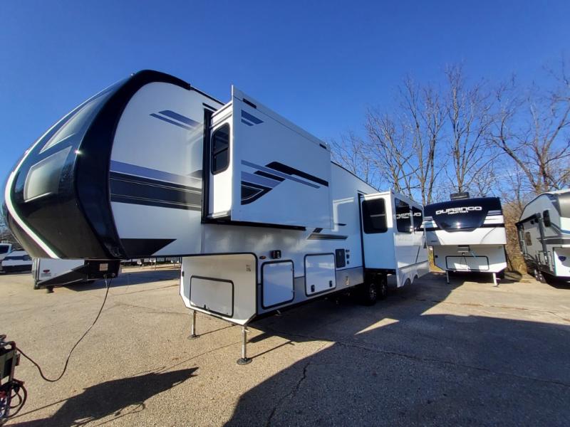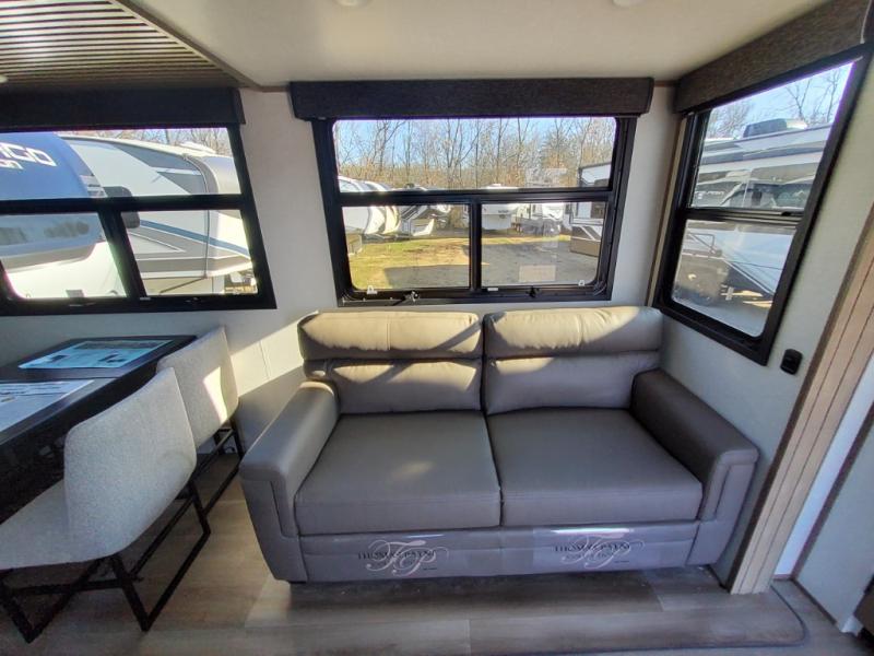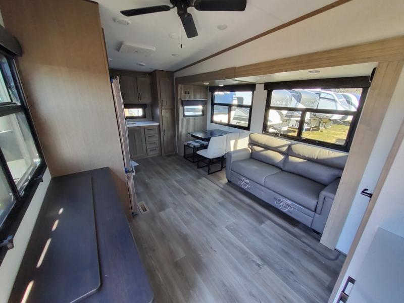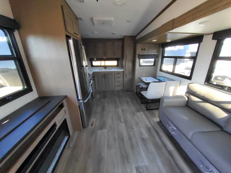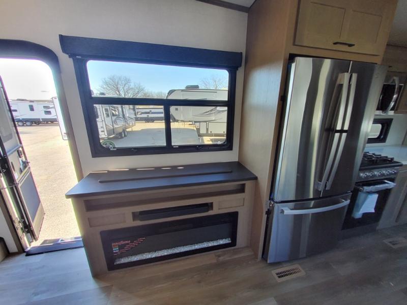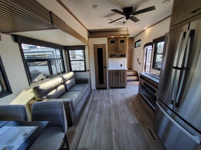 The chef will love cooking in the rear kitchen of this fifth wheel! They could even cook the catch of the day on the outside griddle while enjoying a cold beverage from the refrigerator. You can enjoy your meals in the legless table with chairs and bench at the kitchen then lay down on the hide-a-bed sofa after stuffing yourself full. There is even a 48" fireplace and a 50" LED TV on lift to enjoy movie nights! Freshen up each morning in the full bathroom with the 48" x 30" residential shower with a seat and easily grab your towel from the linen closet next to it. When you're ready to wind down your nights, head to the front private bedroom to change into your pajamas stored in the dresser or from the front wardrobe that includes washer and dryer prep. There is also a king bed slide out or you can choose the optional queen bed if you want more floor space. The hitch receiver comes with a four pin harness adds more security!