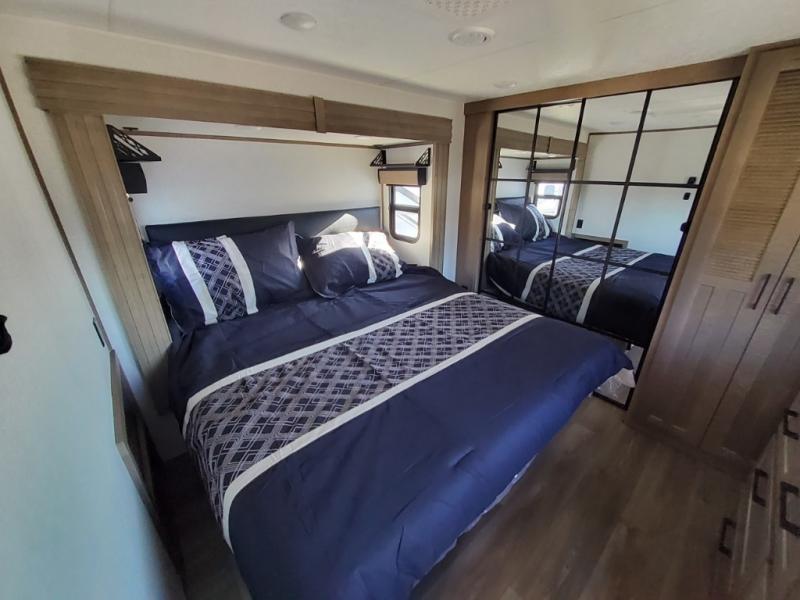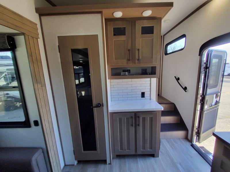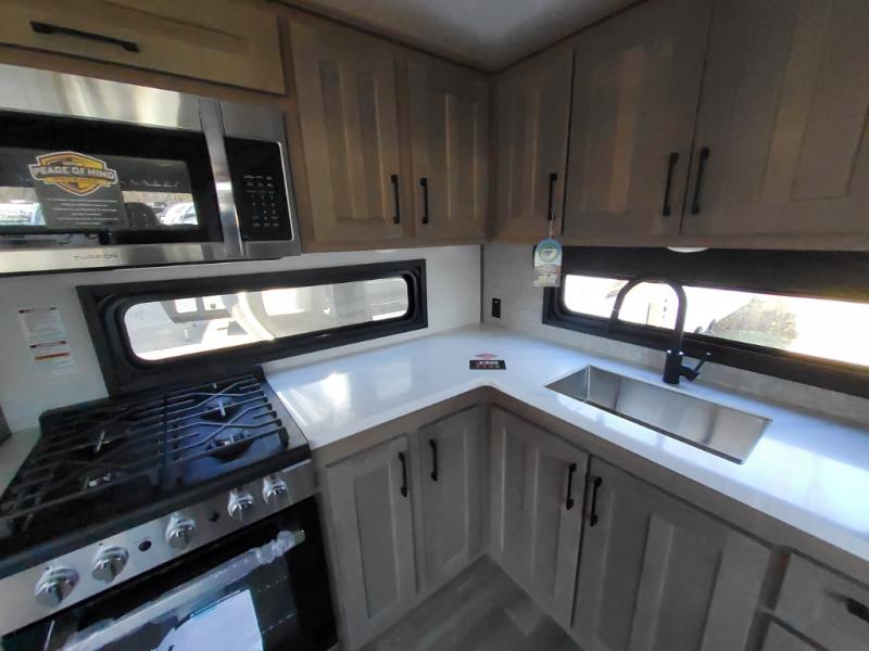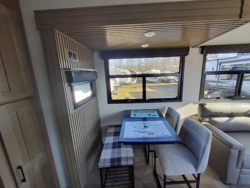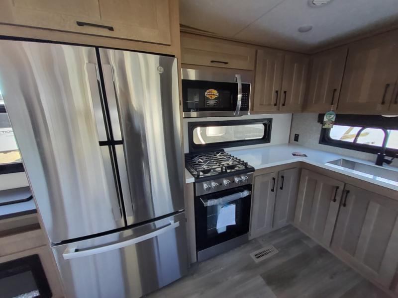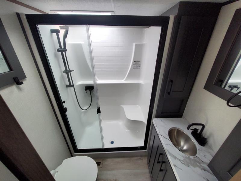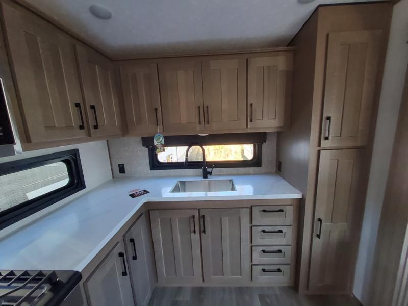 The chef will love cooking in the rear kitchen of this fifth wheel! They could even cook the catch of the day on the outside griddle while enjoying a cold beverage from the refrigerator. You can enjoy your meals in the legless table with chairs and bench at the kitchen then lay down on the hide-a-bed sofa after stuffing yourself full. There is even a 48" fireplace and a 50" LED TV on lift to enjoy movie nights! Freshen up each morning in the full bathroom with the 48" x 30" residential shower with a seat and easily grab your towel from the linen closet next to it. When you're ready to wind down your nights, head to the front private bedroom to change into your pajamas stored in the dresser or from the front wardrobe that includes washer and dryer prep. There is also a king bed slide out or you can choose the optional queen bed if you want more floor space. The hitch receiver comes with a four pin harness adds more security!