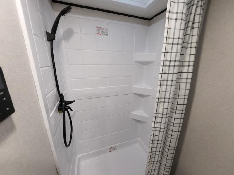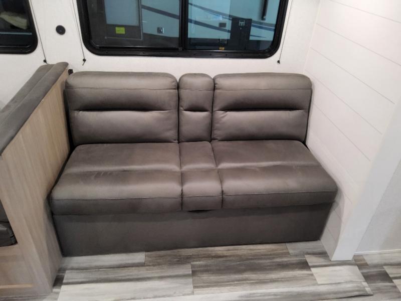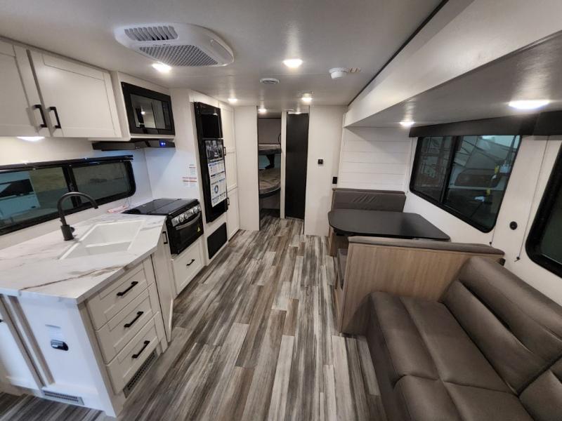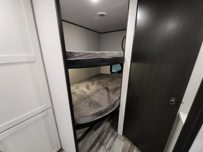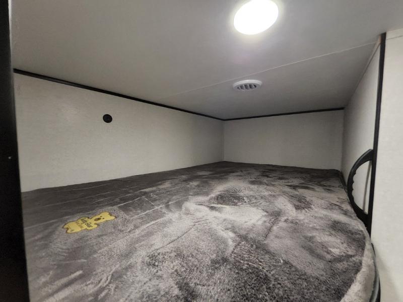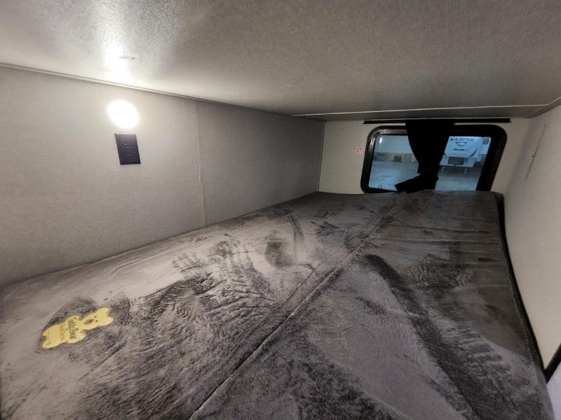You can comfortably sleep up to ten people in this trailer thanks to the double-size bunks in back, the RV queen bed in the front bedroom, plus the booth dinette and jack-knife sofa in the main living area! The chef of your crew will have a three burner cooktop and microwave oven to prepare meals, and everyone can store their favorite drinks in the 8 cu. ft. 12V refrigerator inside, or in the outdoor refrigerator for convenience. The rear corner bathroom includes a tub/shower and a toilet, with the sink just outside of this room so others can brush their teeth if one is taking a shower before bed. The outside storage is accessible on both sides of the unit and will easily allow you bring along camp chairs, yard games and more. A 16' powered awning with LED lights will create a nice place to gather in the evenings with family and friends!
