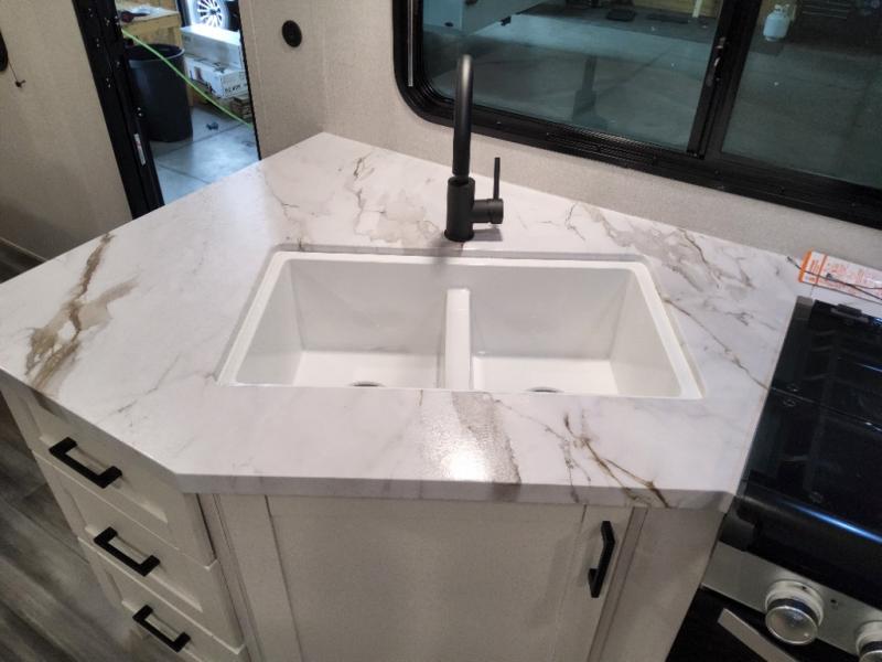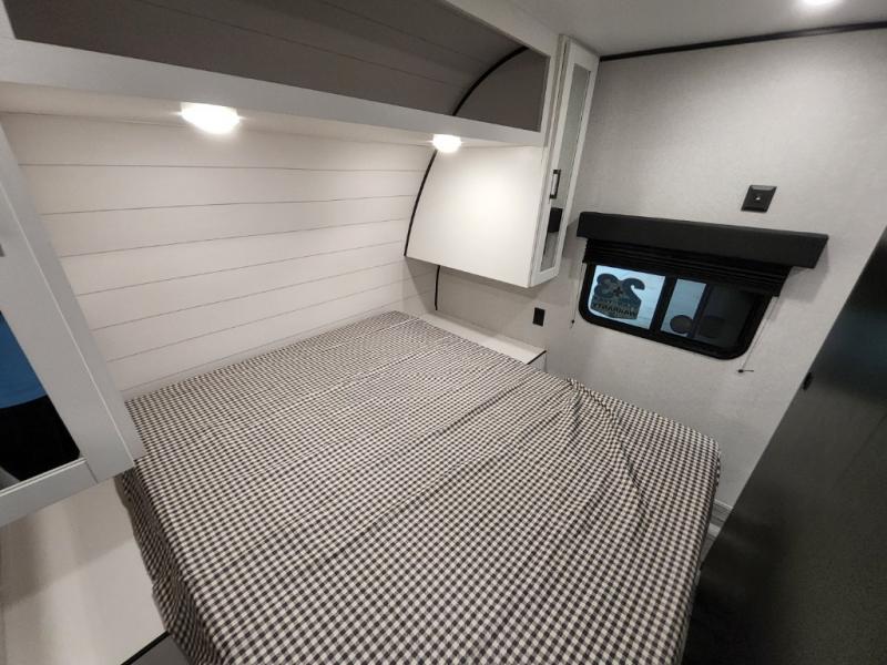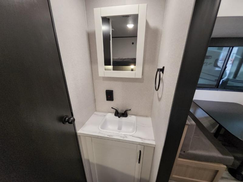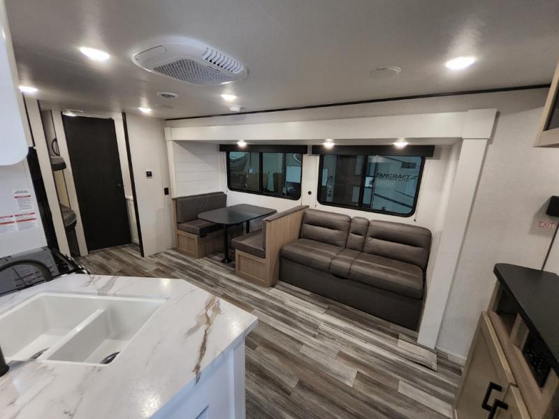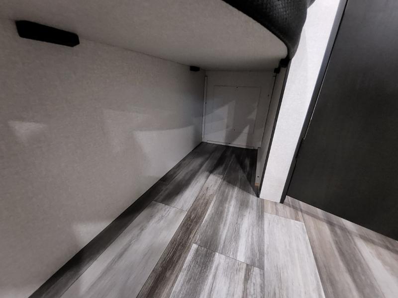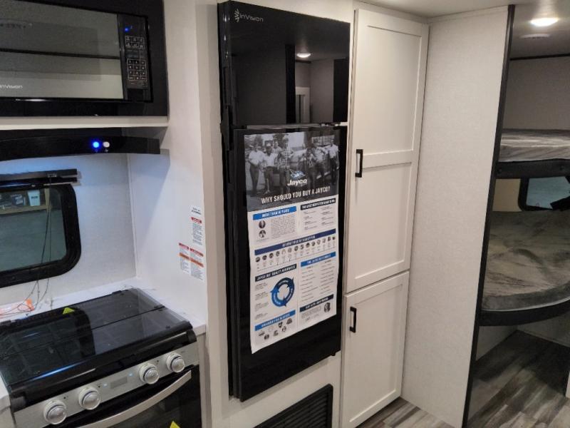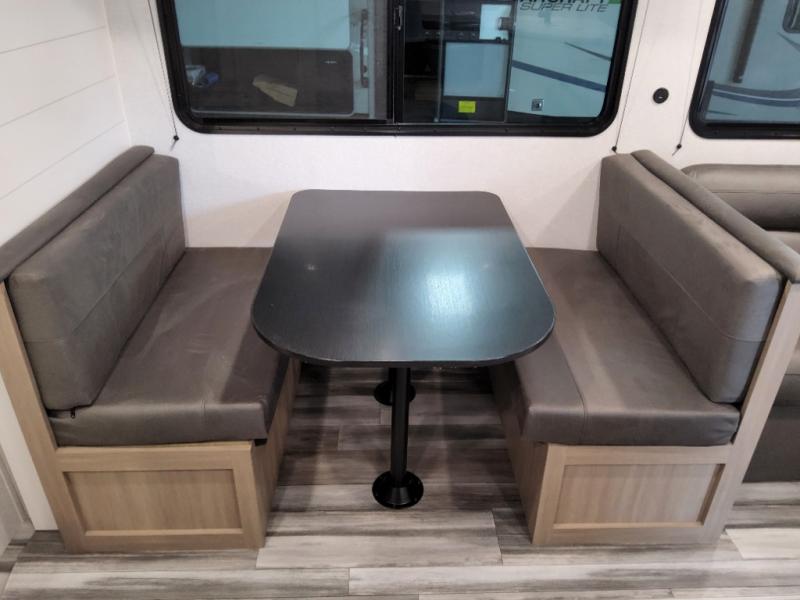 You can comfortably sleep up to ten people in this trailer thanks to the double-size bunks in back, the RV queen bed in the front bedroom, plus the booth dinette and jack-knife sofa in the main living area! The chef of your crew will have a three burner cooktop and microwave oven to prepare meals, and everyone can store their favorite drinks in the 8 cu. ft. 12V refrigerator inside, or in the outdoor refrigerator for convenience. The rear corner bathroom includes a tub/shower and a toilet, with the sink just outside of this room so others can brush their teeth if one is taking a shower before bed. The outside storage is accessible on both sides of the unit and will easily allow you bring along camp chairs, yard games and more. A 16' powered awning with LED lights will create a nice place to gather in the evenings with family and friends!