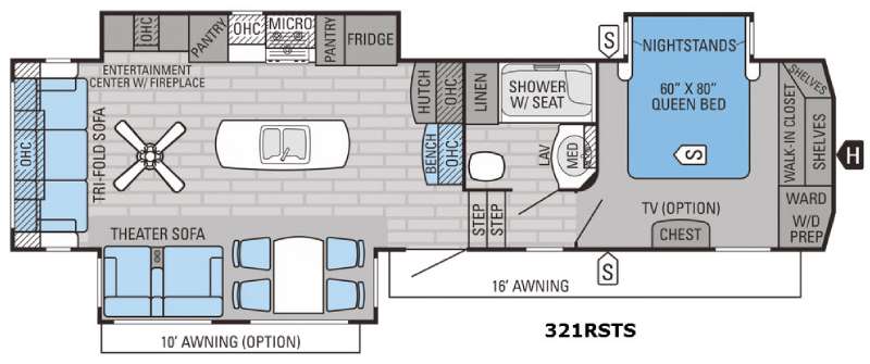 - Washer/Dryer Prep (Not applicable in 291RSTS, 325BHQS, or 339FLQS), MOR/RYDE® EZ-Stow™ toolbox